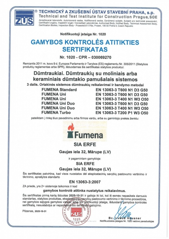 Mūsų kaminų sistemos atitinka visus galiojančius Europos standartus – EN 13063-1, EN 13063-2 ir EN 13063-3. Jų kokybę patvirtina Europos CE sertifikatai, užtikrinantys patikimą ir ilgalaikį naudojimą.